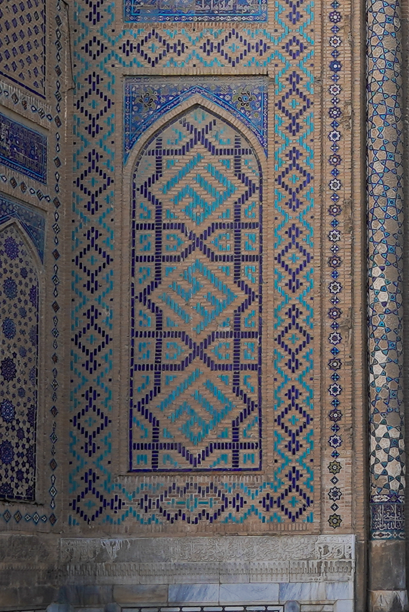 측면의 건축물은 둘 다 굴곡진 돔으로 되어 있는데, 구르아미르의 중앙 돔과 유사하다.