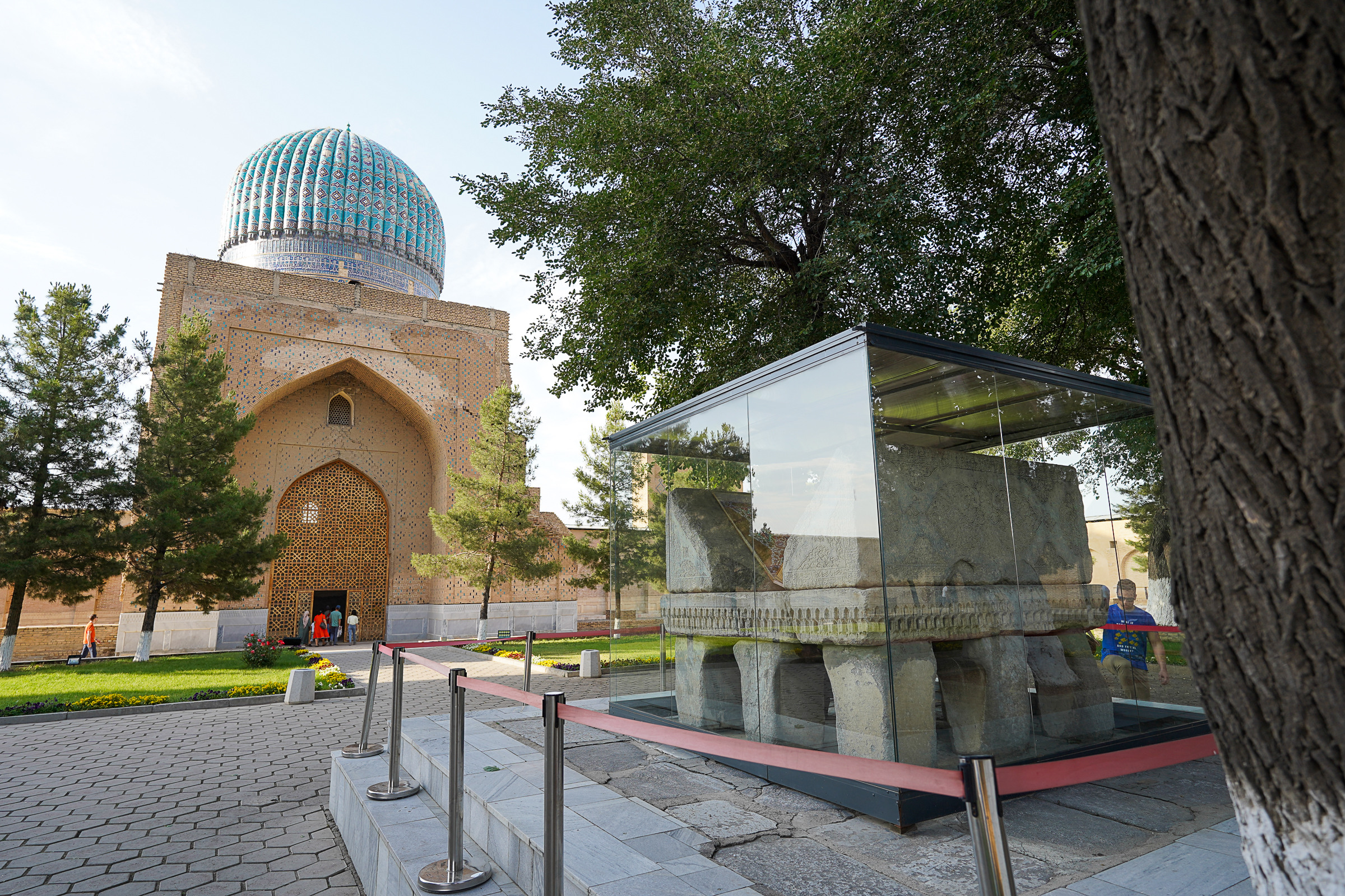 비비하눔 모스크. 1406년에 만들어진 모스크이다. 티무르 시기, 사마르칸트에서 가장 큰 건물로 꼽힌다. 당시 회중모스크(금요일 모스크)로 사용하기 위해 만들었으며, 규모는 동시에 만 명을 수용할 수 있는 정도이다. 600년 전에 만들어진 건물임에도, 20세기 후반에 이르기까지 사마르칸트에서 가장 높은 건물이었다.