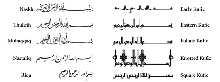 이슬람에서는 교리에서 사람과 동물의 모습을 그리는 것을 금지하고 있다. 그래서 이슬람 건축들은 문자나 기하학적 문양을 사용하는 것이 발전하였다. 특히 알라와 무하마드를 기리는 문자를 많이 사용한다.